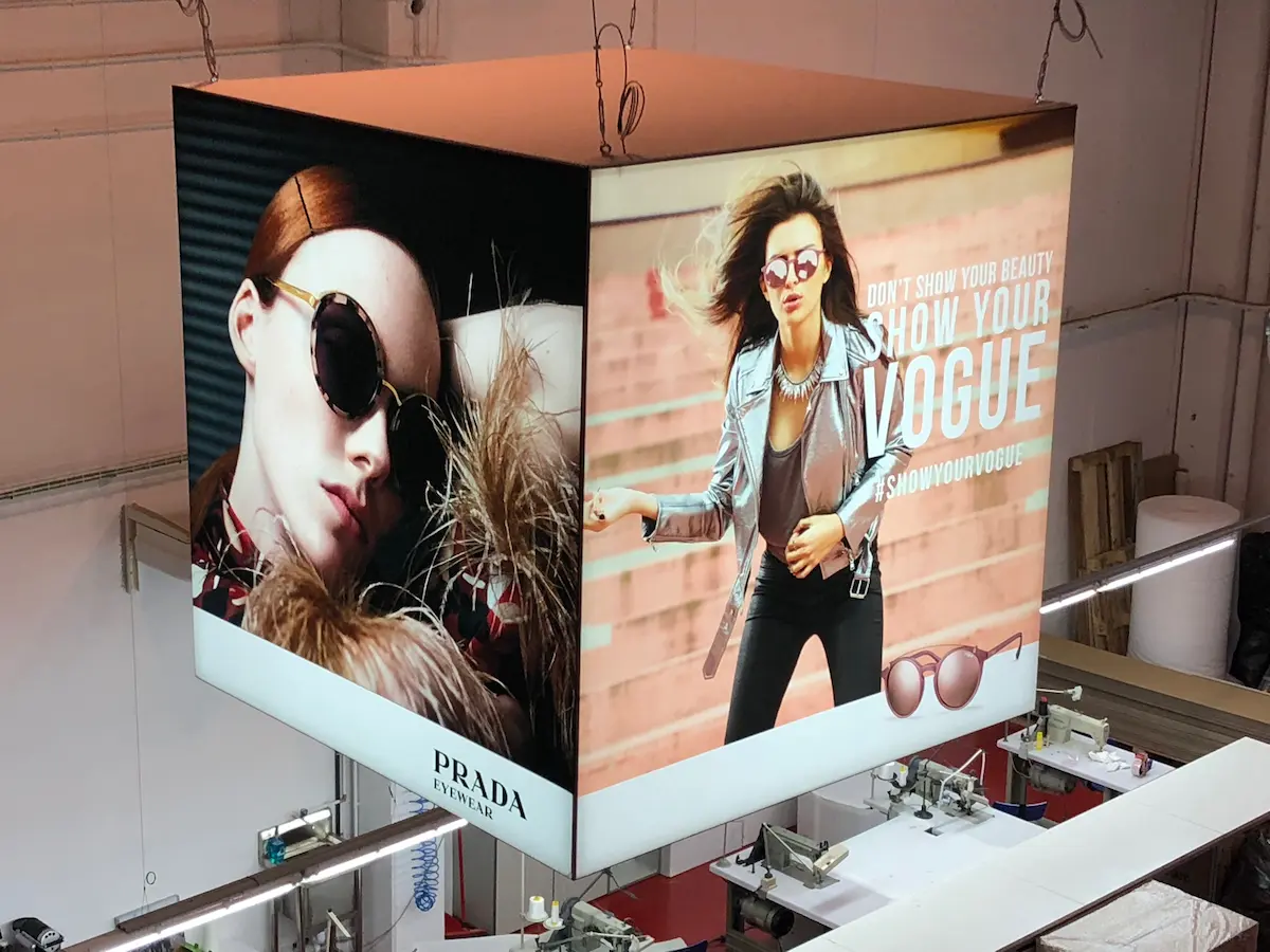 Estructura prismática con gráfica a cuatro, seis u ocho caras, sin aristas de aluminio visibles. Puede tener iluminación tanto en la parte exterior como en la interior.